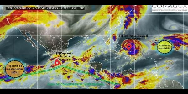 La depresión tropical Marty será la causante de dichas condiciones, la cual se encontrará en etapa de disipación aproximadamente a 145 kilómetros al suroeste de Zihuatanejo, Guerrero, y a 150 kilómetros al sur de Lázaro Cárdenas, Michoacán, indicó el Servicio Meteorológico Nacional (SMN).