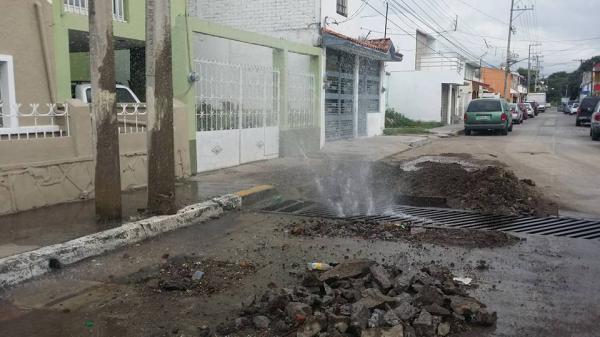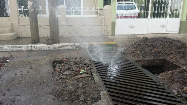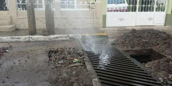 En una alcantarilla de la colonia se observa el agua salir a chorros, a manera de fuente, y alrededor de ésta hay enormes agujeros.