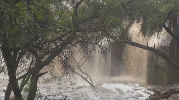 En Aguascalientes, las fuertes lluvias registradas por el paso del huracán Patricia, ocasionaron que una presa se desbordara.