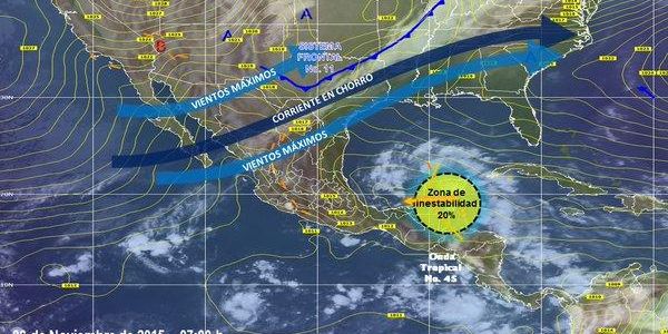 La onda tropical número 45, que se extenderá sobre el centro y sur del Golfo de México, continuará asociada a una zona de inestabilidad con potencial ciclónico que se localizará frente a las costas de Tabasco y Campeche.En su rápido avance hacia el oeste, ambos sistemas provocarán potencial de lluvias puntuales intensas en Quintana Roo y Yucatán; muy fuertes en Veracruz, Tabasco, Chiapas, y Campeche; y fuertes en Oaxaca, Hidalgo y Puebla.
