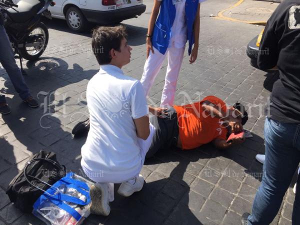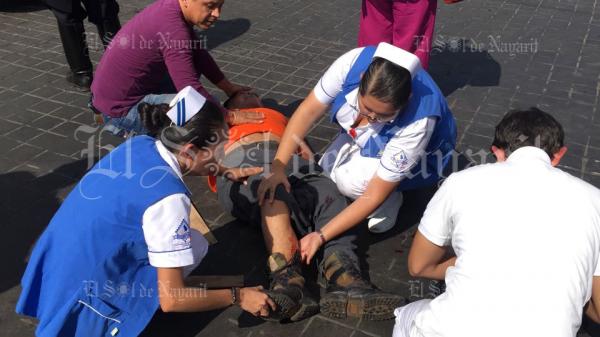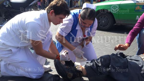 Afortunadamente al momento del percance un grupo de paramédicos de la Universidad Autónoma de Nayarit pasaban por el lugar y brindaron los primeros auxilios al hombre, como realizarle un vendaje para detener el sangrado en su pierna.