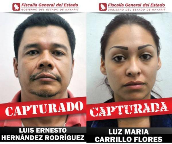 La Fiscalía General del Estado (FGE) de Nayarit informó que gracias a un operativo implementado por los elementos, se logró la captura de Luz María Carrillo Flores, de 19 años de edad, originaria de Baja California y vecina de Xalisco; Luis Ernesto Hernández Rodríguez y/o Lucio Ortega Rodríguez, alias El Cora, de 32 años de edad, originario de Borbollón y vecino de Xalisco.