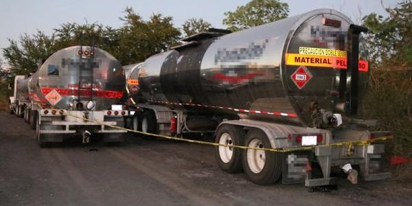En un comunicado, la dependencia informó que elementos de la Policía Federal detuvieron a dos sujetos a bordo de dos camiones tipo Tractor, doblemente acoplados a un remolque y semirremolque tipo Tanque.