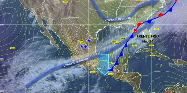 En tanto, el Frente Frío Número 34 se extenderá desde la costa oriental de Estados Unidos de América hasta la Península de Yucatán y el sureste mexicano, lo cual provocará lluvias fuertes (de 25 a 50 mm) en Veracruz, Tabasco, Chiapas y Campeche, y precipitaciones pluviales aisladas (de 0.1 a 25 mm) en Hidalgo, Puebla, Oaxaca, Yucatán y Quintana Roo.