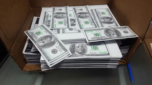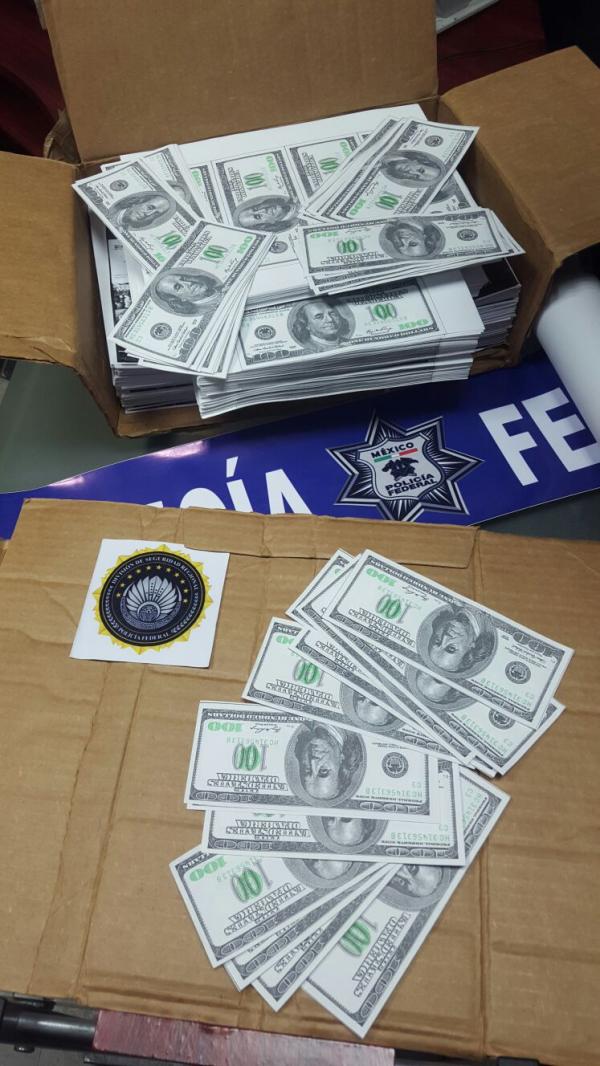 En coordinación con la autoridad ministerial los policías federales revisaron el interior de la caja donde se encontraron 400 hojas con varias impresiones de billetes similares a los de 100 dólares estadounidenses, las cuales tenían las dimensiones y coloración similares a los originales.
