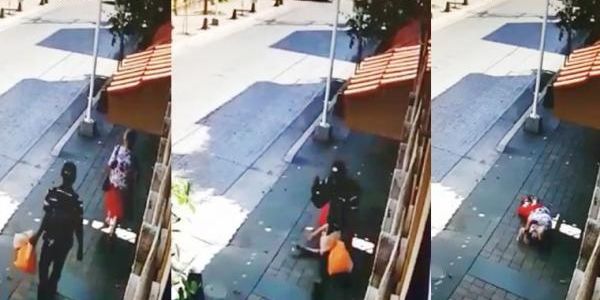 En el video se observa como detrás de ella aparece un sujeto, quien rápidamente le arrebata el bolso con tal fuerza que hace que la mujer se caiga y quedé en el piso.