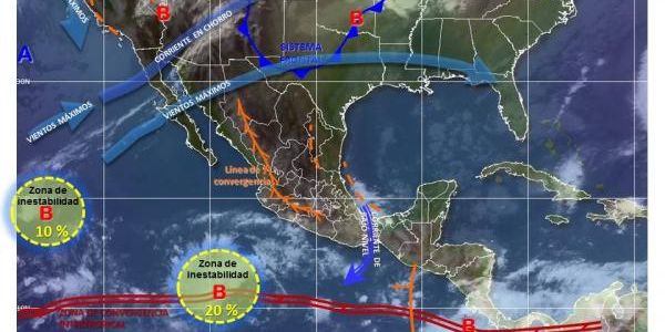 Un canal de baja presión que se extiende desde el norte hasta el centro del país se asociará al calentamiento diurno, y favorecerá lluvias con intervalos de chubascos en Jalisco, Michoacán, Guerrero, Estado de México, Ciudad de México, Morelos y Puebla, y lluvias escasas o lloviznas en Nuevo León, Tamaulipas, Durango, Nayarit, Colima, Hidalgo y Tlaxcala.