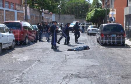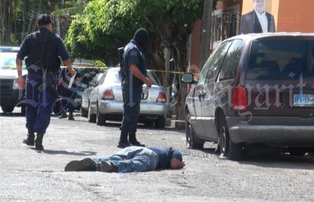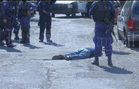 Policías Municipales y Estatales acordonan el área de la balacera y espera la llegada del personal del Servicio Médico Forense, quienes se harán cargo del levantamiento del cuerpo.
