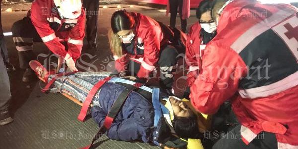 Paramédicos de la Cruz Roja Mexicana atendieron esta noche a una joven mujer, quien sufrió un fuerte accidente cuando circulaba a bordo de una motocicleta Italika en compañía de su pareja sentimental sobre la Avenida Aguamilpa.