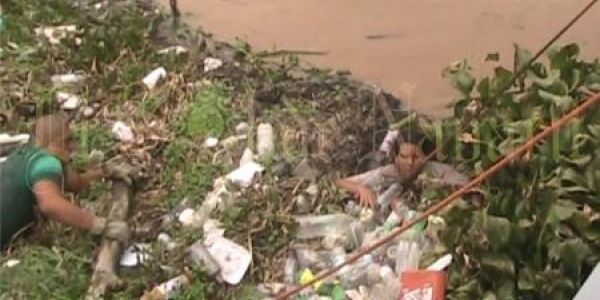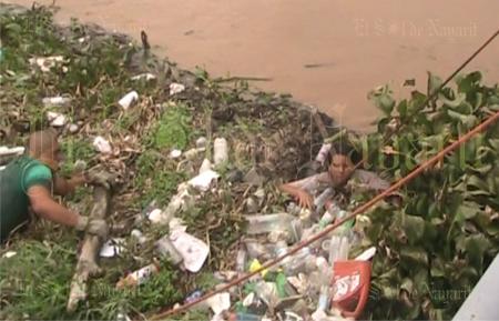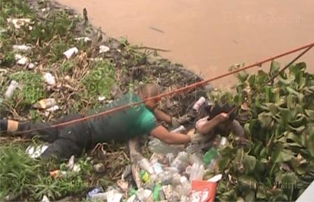 La corriente del río no era alta reduciendo el peligro, pero aun así la mujer quedó atrapada entre tierra y botes de plástico, con la mitad del cuerpo sumergido en el agua.