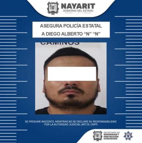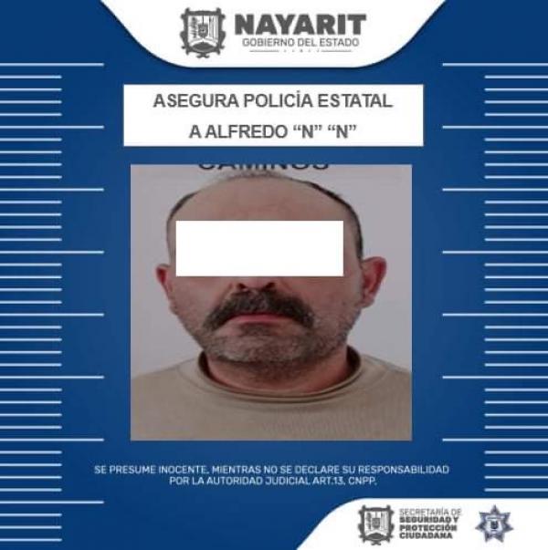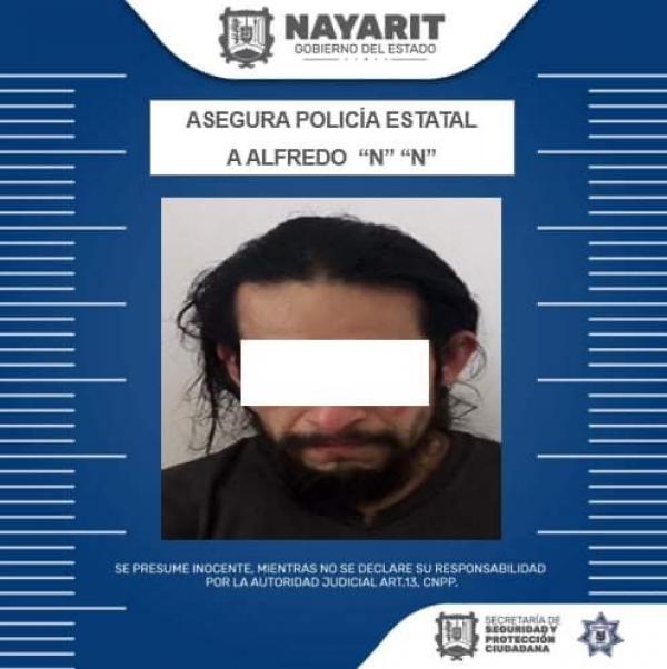 2.- Alfredo "N" "N", de 34 años, fue asegurado a la altura de la caseta de cobro de Santa María del Oro, por su presunta participación en el hecho delictuoso de delitos contra la salud, asegurándole un envoltorio de plástico conteniendo en el interior una sustancia cristalina y granulada con las características propias de la droga conocida como cristal.