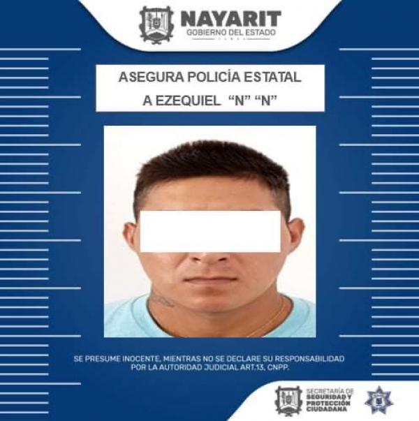4.- Ezequiel "N" "N", de 33 años, fue asegurado en la colonia Mololoa de Tepic, por su presunta participación en el hecho delictuoso de delitos contra la salud, asegurándole un envoltorio de plástico conteniendo en el interior una sustancia cristalina y granulada con las características propias de la droga conocida como cristal.