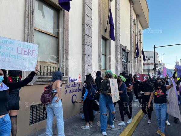 Alrededor de las ochocientas mujeres que se manifestaron en el día internacional de la mujer, a su llegada a palacio de gobierno, como parte de su protesta realizaron pintas de color morado y verde en los muros del edificio, dejando mensajes en contra del machismo y de la violencia de genero.