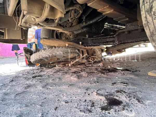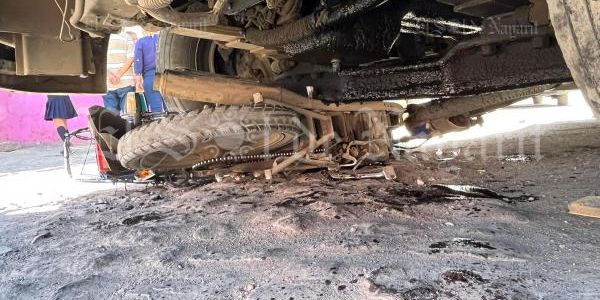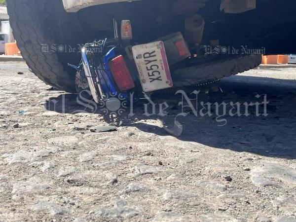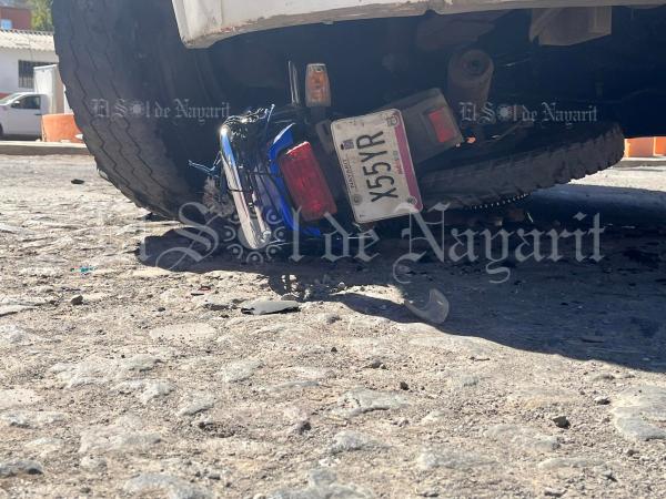 Tras el fuerte Impacto, la motocicleta con placas X55YR quedó prensada debajo de la pesada unidad, además dejó derramamiento de combustible.