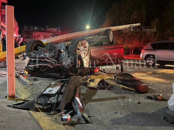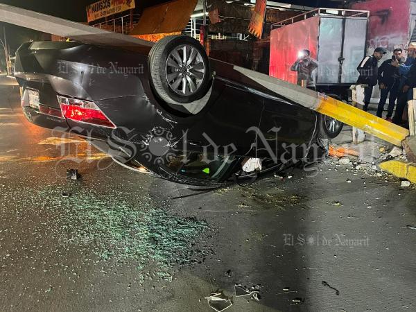 El auto negro completamente fuera de control y con gran su parte delantera destrozada, vuelca y se impacta contra un poste de CFE, mismo que derriba y provoca que los cables queden colgando.