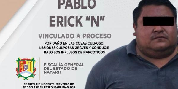 La Fiscalía General del Estado a través de la Agencia del Ministerio Público de la localidad de Bucerías, municipio de Bahía de Banderas, logró vinculación a proceso contra Pablo Erick "N", por su presunta responsabilidad penal en la comisión de los delitos de daño a las cosas culposo, lesiones culposas graves y delito de tránsito ejecutado por conductores de vehículos, en su modalidad de conducir bajo los influjos de narcóticos.