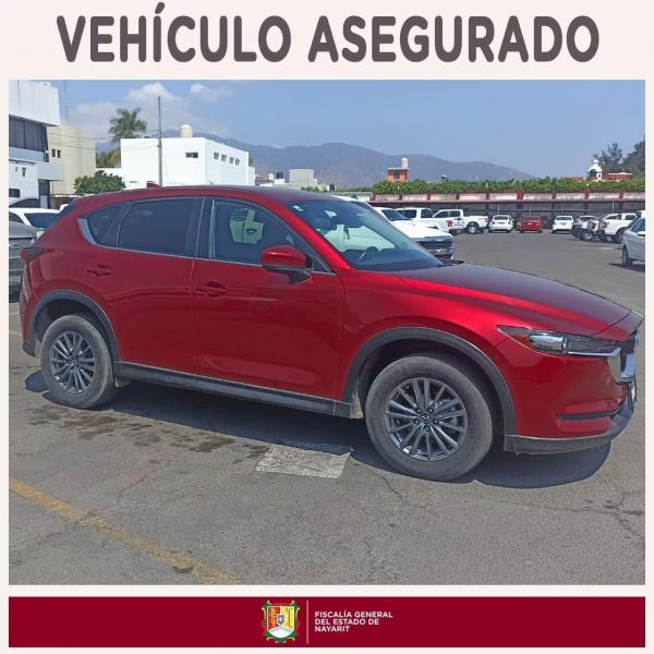 Dicha unidad es de la marca Mazda, tipo CX-5, modelo 2019, color rojo, con placas de circulación RHB-77-82 del estado de Nayarit; número de serie JM3KFAC75K0702914. Cabe señalar que el vehículo automotor y el detenido fueron puestos a disposición del Ministerio Público para las gestiones legales que procedan.