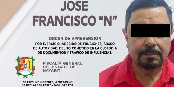 Tepic, Nayarit; 1 de julio de 2022.- Fiscalía General del estado de Nayarit a través de la Agencia de Investigación Criminal, dio cumplimiento a una orden de aprehensión que se ejecutó contra José Francisco N, por su probable participación en hechos que la ley califica como delitos de ejercicio indebido de funciones, abuso de autoridad, delito cometido en la custodia de documentos y tráfico de influencias, todos ellos cometidos en agravio de los Servicios de Educación Pública del estado de Nayarit (SEPEN) y de la sociedad.