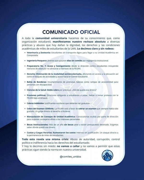 Lo anterior ha dejado sin duda al descubierto el nulo trabajo de la rectora de la Universidad Autónoma de Nayarit, Norma Liliana Galván Meza, y es que, la comunidad universitaria, a través de un comunicado expuso que rechaza categóricamente las prácticas y abusos que dañan la dignidad de cada uno de los alumnos.