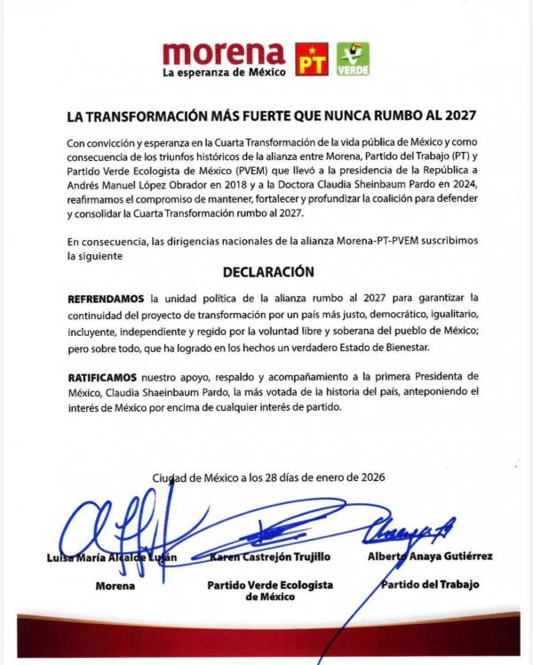 Este miércoles se dio a conocer de manera oficial la consolidación de la alianza entre los partidos de Movimiento de Regeneración Nacional, Partido del Trabajo y el Partido Verde, respectivamente, rumbo a la elección del 2027.