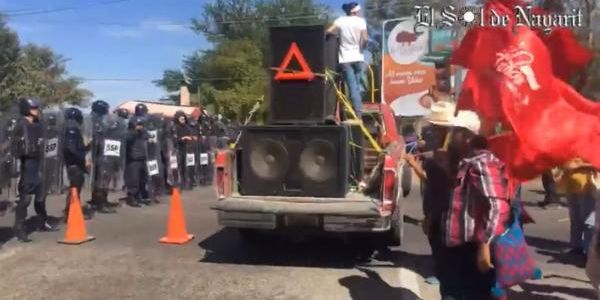 Elementos del cuerpo antimotines de la Policía Estatal arribaron a hasta el boulevard Tepic - Xalisco, en los límites entre ambos municipios, donde un grupo de integrantes de la agrupación Antorcha Campesina mantenía bloqueado el paso.