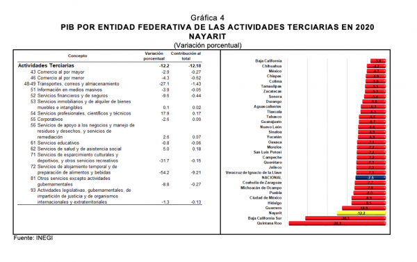 Nayarit observó un decremento anual en términos reales de (-)11.4 por ciento, en el total de su economÃa durante 2020, según los resultados anuales del Producto Interno Bruto por Entidad Federativa (PIBE) en su versión preliminar del INEGI. La caÃda del (-)11.4% en su actividad económica o...