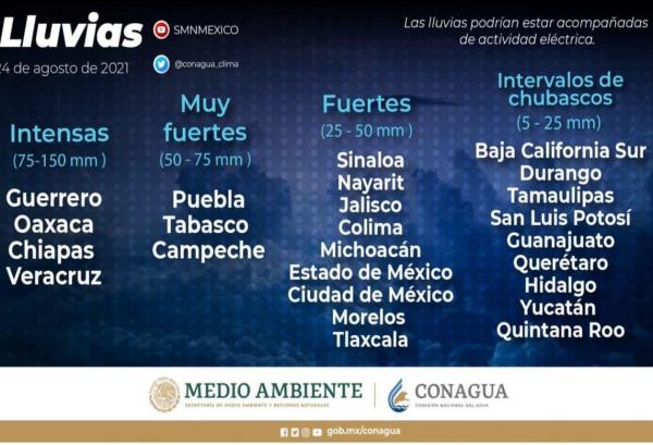 Se prevén intervalos de chubascos con lluvias puntuales fuertes (25.1 a 50.0 mm) en : Sinaloa, Nayarit, Jalisco, Colima, Michoacán, Estado de México, Ciudad de México, Morelos y Tlaxcala. Posible caÃda de granizo: Durango, Sinaloa, Nayarit, Jalisco, Colima, Michoacán, Estado de México, Ciu...