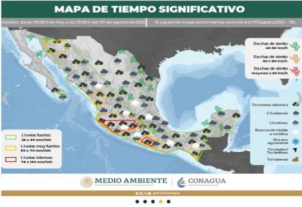 La comisión Nacional del Agua (CONAGUA) dio a conocer el pronóstico de lluvias para este sábado 7 de agosto de 2021. Según la comisión, habrá intervalos de chubascos con lluvias puntuales fuertes (25.1 a 50.0 mm): Baja California Sur, Zacatecas, Nayarit, Colima, Michoacán, Estado de Méxic...
