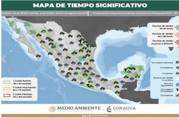 La comisión Nacional del Agua (CONAGUA), informó el pronóstico de lluvias para este miércoles 4 de agosto de 2021. Se presentarán intervalos de chubascos con lluvias puntuales fuertes (25.1 a 50.0 mm) en Baja California Sur, Aguascalientes, Zacatecas, Nayarit, Jalisco, Michoacán, Morelos, C...