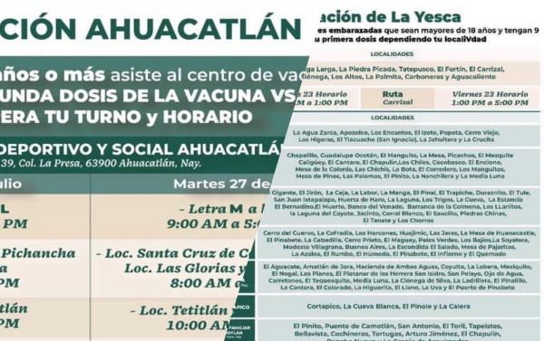Esta mañana a través de sus redes sociales, la secretarÃa del Bienestar dio a conocer que será en los municipios de la Yesca y Ahuacatlán donde arranque la aplicación de la segunda dosis para personas de 50 a 59 años de edad. Dicha dosis comenzó a aplicarse desde el dÃa de ayer en la Yes...