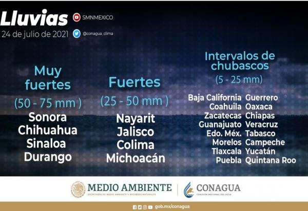 Intervalos de chubascos con lluvias puntuales fuertes (25.1 a 50.0 mm) se esperan en: Nayarit, Jalisco, Colima y Michoacán. Asimismo, hay posibilidad de caÃda de granizo en: Sonora, Chihuahua, Durango, Sinaloa, Zacatecas, Nayarit, Jalisco, Colima y Michoacán. Posibilidad de tormentas eléct...