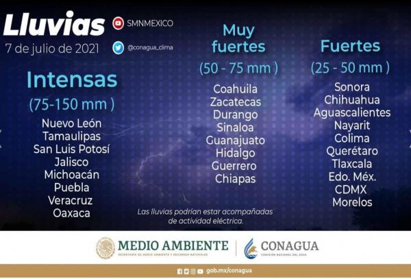 Se prevén intervalos de chubascos con lluvias puntuales fuertes (25.1 a 50.0 mm): Sonora, Chihuahua, Aguascalientes, Nayarit, Colima, Querétaro, Tlaxcala, Ciudad de México y Morelos. PacÃfico Centro: Cielo medio nublado durante la mañana y nublado por la tarde con lluvias puntuales intensas ...