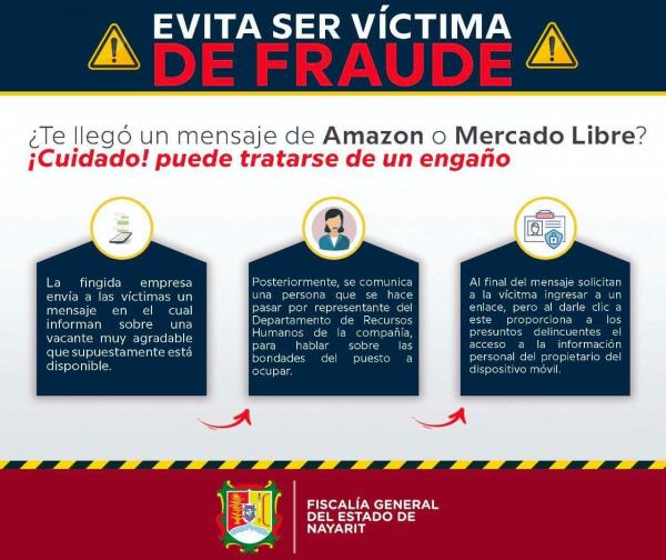 Tepic, Nayarit; viernes 1 de julio de 2022.- La FiscalÃa General del estado de Nayarit hace del conocimiento a la sociedad sobre una conducta criminal que se realiza vÃa WhatsApp o SMS, donde ofertan empleo en la compañÃa Amazon y Mercado Libre, lo cual resulta ser un engaño de delincuentes par...
