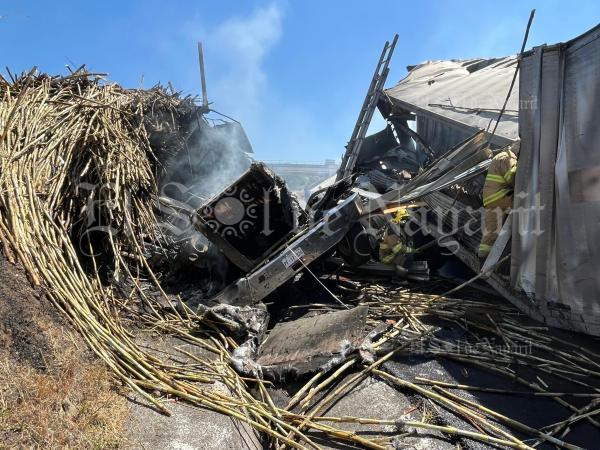 Se registró un aparatoso accidente este viernes sobre Libramiento Norte de Tepic, sobre la carretera que conduce a CamichÃn de Jauja. Según el reporte, un camión cañero se quedó sin frenos y terminó impactando a un tráiler en su parte trasera, posterior a ello el camión comenzó a incend...