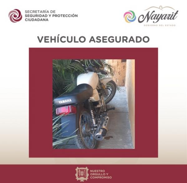Tepic, Nayarit; 11 de enero de 2022.- Elementos de la PolicÃa Estatal de la SecretarÃa de Seguridad y Protección Ciudadana asegura una motocicleta que tuviera reporte de robo en calles de la ciudad de Tepic. Se trata de una motocicleta de la marca Yamaha, color blanco, modelo 2021, con reporte...