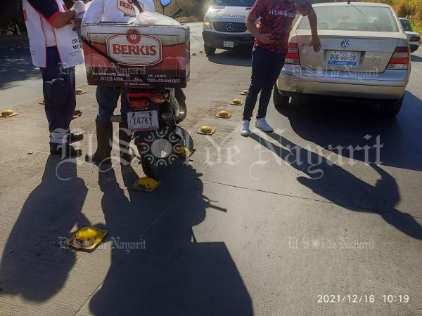 Este jueves se registró un accidente por alcance sobre la avenida México con dirección hacia el Conalep en la capital nayarita. Se vieron involucrados una motocicleta de la marca Honda tipo Cargo en color rojo con placas de circulación X47KY, la cual pertenece a una carnicerÃa, y un vehÃcul...