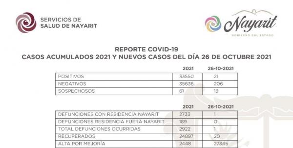 Este martes, el Estado de Nayarit registró 21 nuevos contagios por coronavirus y solo una defunción. Ambos números corresponden a las últimas 24 horas, de acuerdo a la información actualizada de la SecretarÃa de Salud, misma que informó, hay un total de 33,550 personas contagiadas y 2,922 ...