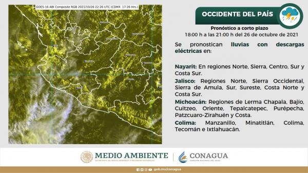 De acuerdo a la información recibida por la dirección local de CONAGUA en Nayarit, la SSPC informó del pronóstico del aumento de nublados con lluvias y tormentas: Pronóstico de Lluvias con Descargas eléctricas para las próximas 3 horas en regiones de Nayarit, Jalisco, Michoacán, Colima ...