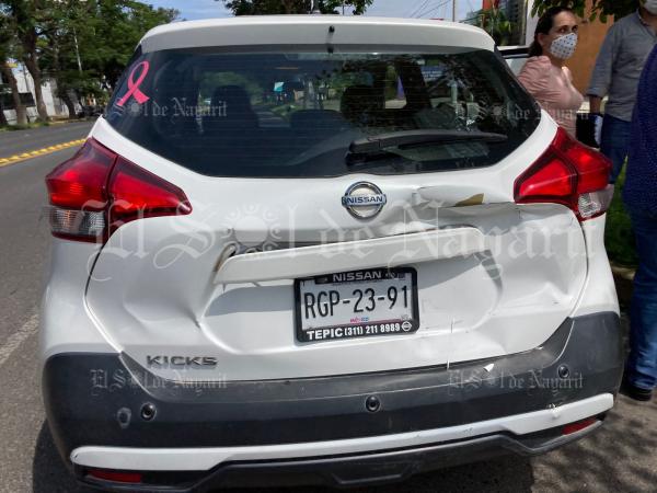 Un nuevo accidente de tránsito se registró esta tarde en Tepic, dejando daños materiales de consideración. Los primeros reportes indican que sobre la avenida Insurgentes circulaba el conductor de una camioneta Nissan RGP-23-91, mismo que se frenó de manera repentina al percatarse de la prese...