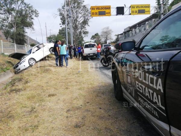 Este sábado, un accidente vial en el Libramiento carretero de Tepic, dejó a un conductor y su vehÃculo varados sobre un canal que se encuentra a orillas de la cinta asfáltica, luego de ser impactados por una camioneta. Se trata de un automóvil de la marca Honda tipo Acord en color blanco, co...