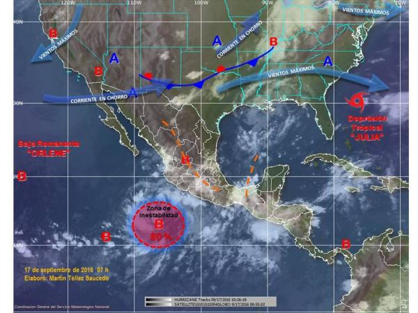 El Servicio Meteorológico Nacional (SMN) prevé zona de inestabilidad o posible ciclón tropical, que se localizará al suroeste de las costas de Colima y Jalisco, y ocasionará potencial de tormentas puntuales intensas en Nayarit, Jalisco, Colima y Michoacán. Asà como tormentas muy fuertes en...