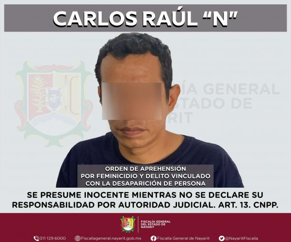 La FiscalÃa General de Nayarit a través de la Agencia de Investigación Criminal ejecutó una orden de aprehensión en la ciudad de Tepic contra Carlos Raúl "N". Por su probable participación en hechos que para la ley configuran los delitos de feminicidio y delito vinculado con la desapariciÃ...