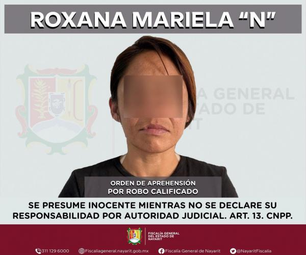 La FiscalÃa General de Nayarit a través de la Agencia de Investigación Criminal ejecutó una orden de aprehensión en la ciudad de Tepic contra Roxana Mariela N. Lo anterior, por su probable participación en hechos que para la ley configuran el delito de robo calificado, en detrimento de una ...