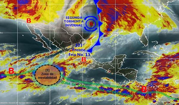 El frente frÃo número 13, en interacción con la segunda tormenta invernal de la temporada, una zona de inestabilidad en el Océano PacÃfico y un canal de baja presión en la PenÃnsula de Yucatán, provocará lluvias fuertes en gran parte del paÃs. El Servicio Meteorológico Nacional (SMN) s...