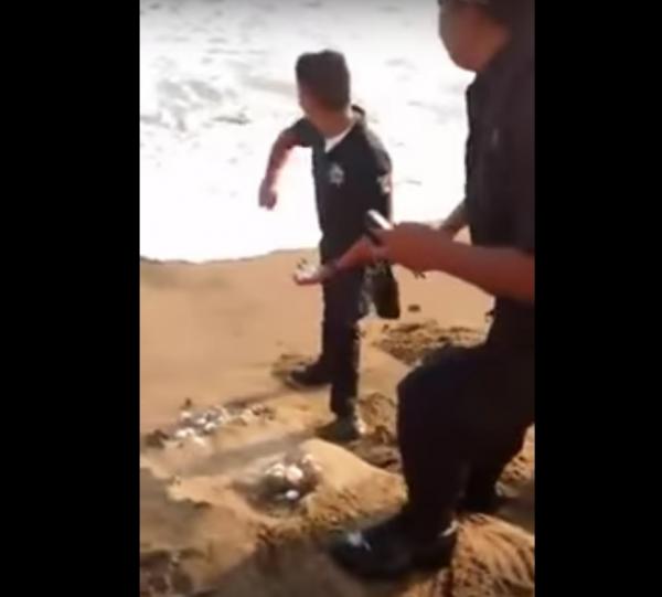 Un turista publicó en su cuenta de la red social Facebook, un video donde denuncia a dos policÃas de Manzanillo, Colima, por arrojar huevos de tortuga al mar. En la grabación se observa a los dos uniformados extrayendo los huevos de un nido en la playa; después uno a uno los van lanzando al m...