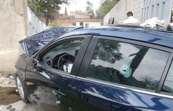 Un hombre se vio obligado a estrellar su automóvil contra una puerta cuando fue atacado a balazos por unos ladrones. Los hechos ocurrieron en el Distrito Federal en la colonia Lomas Altas de la delegación Hidalgo, cuando un hombre que conducÃa un vehÃculo Mazda color azul marino, fue persegui...
