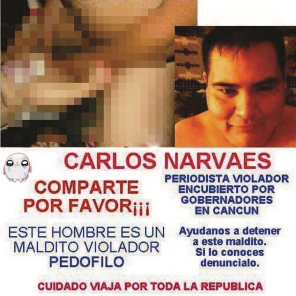 En redes sociales circula una imagen donde se acusa a Carlos Narváez, supuesto periodista, de ser pedófilo y violador. En las redes sociales se ha viralizado la imagen donde se acusa a Carlos Narváez de ser pedófilo, igualmente en la imagen se señala que es periodista y protegido de gobernad...