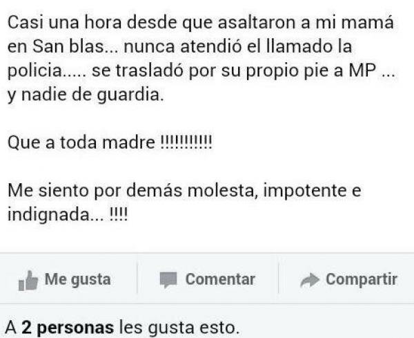 Con total falta de seguridad viven los pobladores de San Blas, que son objeto de robos con violencia mientras que la policÃa municipal brilla por su ausencia y el llamado LayÃn solo se enfoca a promocionar su imagen personal, lejos de atender las verdaderas necesidades del municipio. Muestra de...