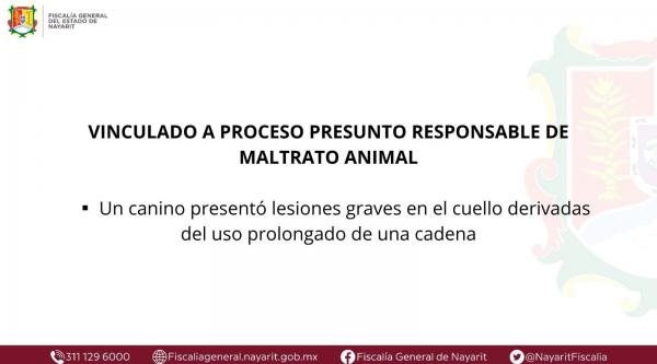 La FiscalÃa General del estado de Nayarit informa que se obtuvo auto de vinculación a proceso contra Diego "N", por su probable responsabilidad en hechos que la ley considera delito contra la ecologÃa y la fauna -en su modalidad de maltrato animal-. De acuerdo con los datos recabados en la inv...