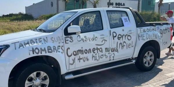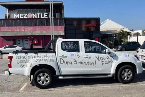 Por toda la carrocería blanca se aprecian los siguientes mensajes como: "Es casado", "Perro infiel", "Relación Abierta es cuando aceptan los dos", "Dura 3 minutos", "Vas a ser papá", "También sube hombres", "¿Camioneta nueva y tus hijos?" "Me dicen el Yen", "Mentiroso", "Rompehogares", entre otras.